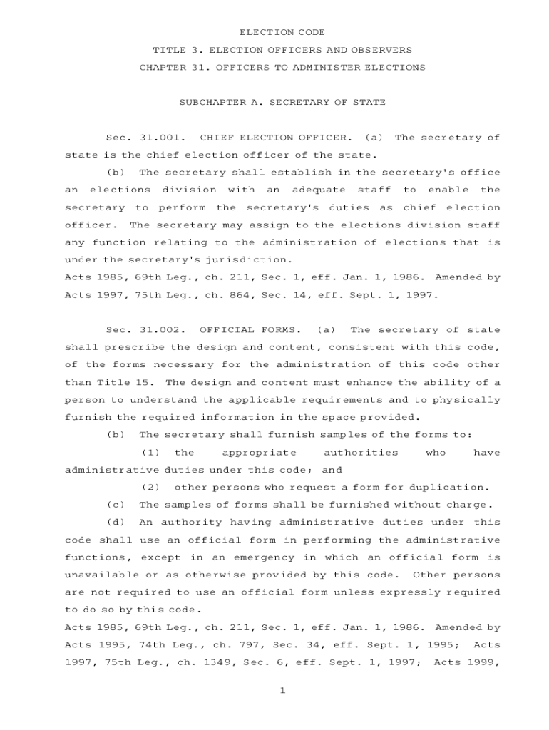 Get the free ELECTION CODE CHAPTER 31. OFFICERS TO ADMINISTER ELECTIONS