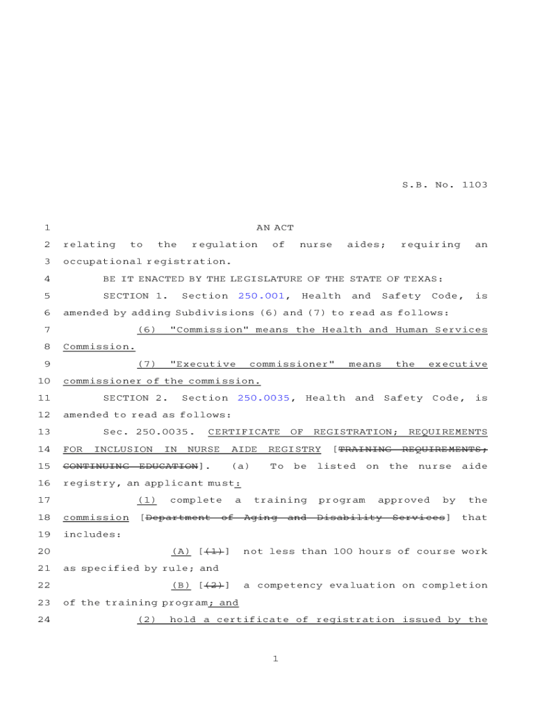 S.B.ANO. A1103AN ACT1 2relatingtotheregulation3occupational registration.ofnurseaides;requiring4BE IT ENACTED BY THE LEGISLATURE OF THE STATE OF TEXAS:5SECTIONA1.AASection6(7)AA\” Executive commissioner\”