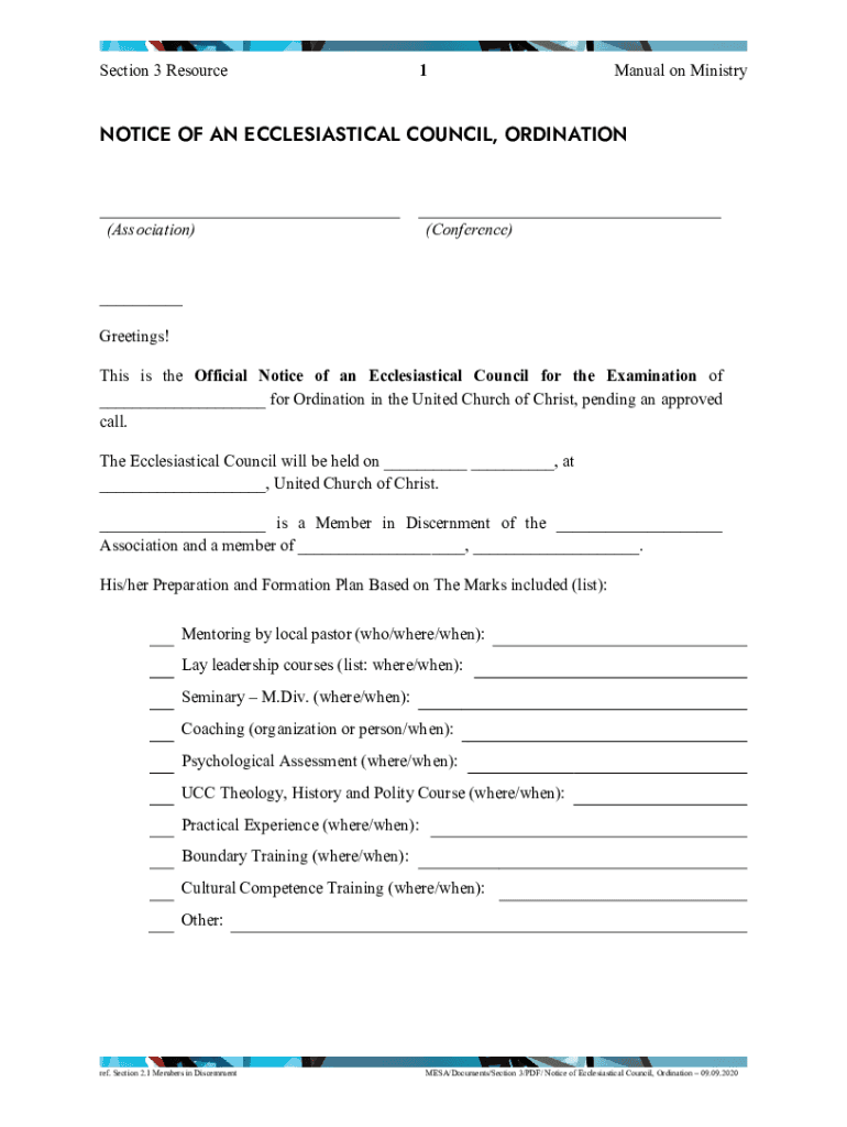 Section 3 Resource1Manual on MinistryNOTICE OF AN ECCLESIASTICAL COUNCIL, ORDINATION(Association)(Conference)___ Greetings! This is the Official Notice of an Ecclesiastical Council for the Examination