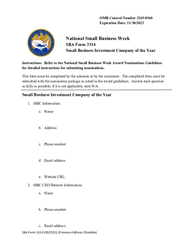 OMB Control Number 32450360 Expiration Date: 11/30/2023National Small Business Week SBA Form 3314 Small Business Investment Company of the Year Instructions: Refer to the National Small Business Week