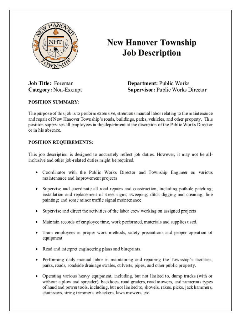 New Hanover Township Job Description Job Title: Foreman Category: NonExemptDepartment: Public Works Supervisor: Public Works DirectorPOSITION SUMMARY: The purpose of this job is to perform extensive,