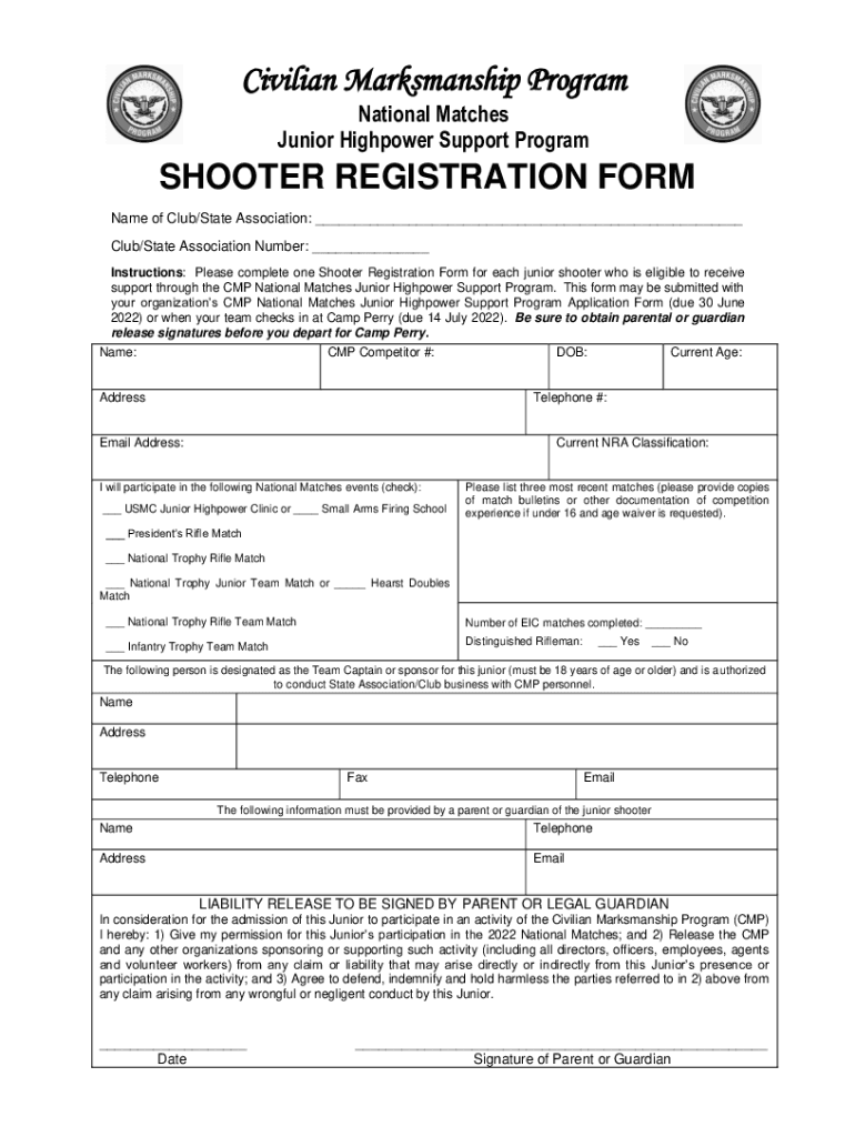 Civilian Marksmanship Program National Matches Junior High power Support ProgramSHOOTER REGISTRATION FORM Name of Club/State Association: ___ Club/State Association Number: ___ Instructions: Please