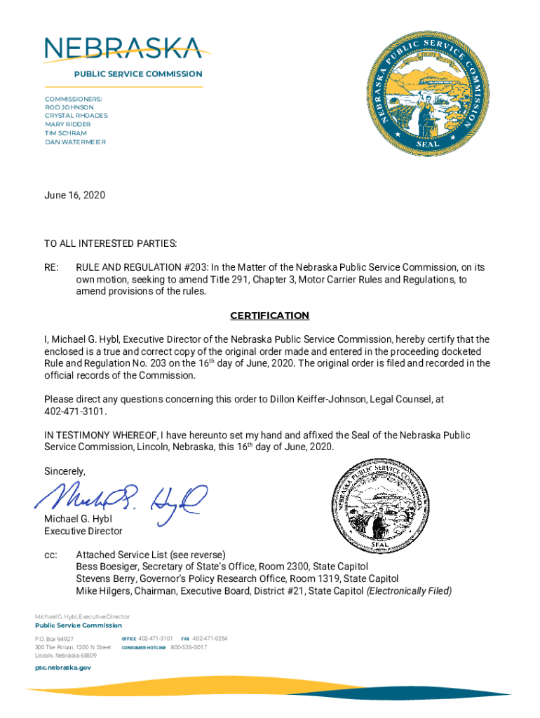 PUBLIC SERVICE COMMISSION COMMISSIONERS: ROD JOHNSON CRYSTAL RHODES MARY RIDER TIM SCRAM DAN WATERMEIERJune 16, 2020TO ALL INTERESTED PARTIES: RE:RULE AND REGULATION #203: In the Matter of the Nebraska