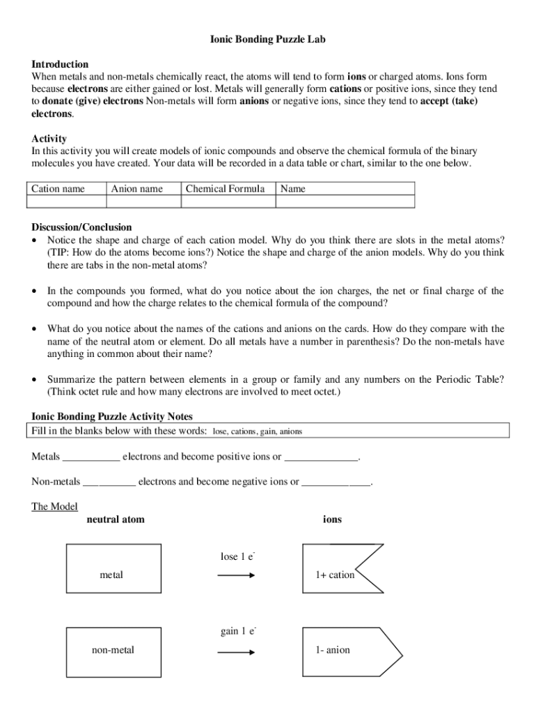 Get the free Ionic Bonding Puzzle Lab.pdf - Introduction When metals ...