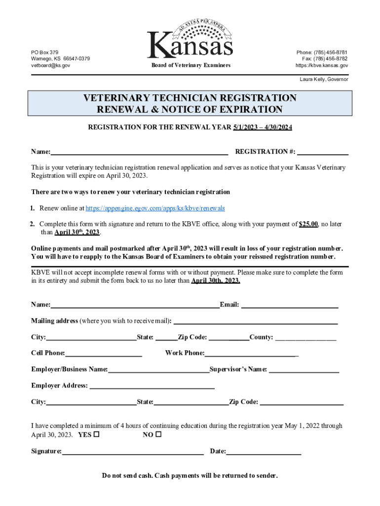 PO Box 379 Cameo, KS 665470379 vetboard@ks.govPhone: (785) 4568781 Fax: (785) 4568782 https://kbve.kansas.govBoard of Veterinary Examiners Laura Kelly, GovernorVETERINARY TECHNICIAN REGISTRATION RENEWAL