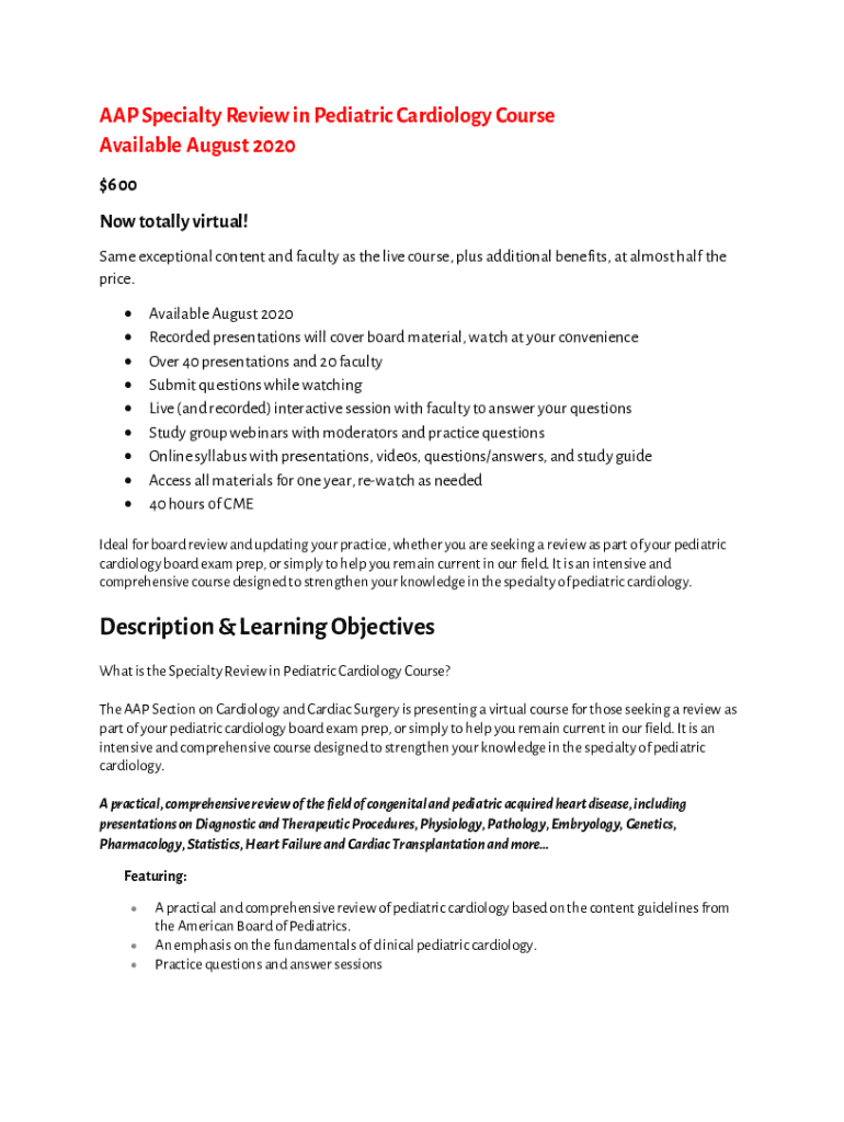 AAP Specialty Review in Pediatric Cardiology Course Available August $2020600 Now totally virtual! Same exceptional content and faculty as the live course, plus additional benefits, at almost half