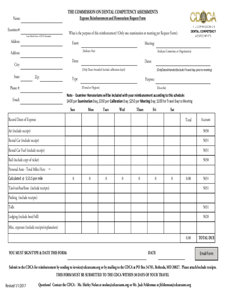THE COMMISSION ON DENTAL COMPETENCY ASSESSMENTS Expense Reimbursement and Honorarium Request Forename: Examiner#:What is the purpose of this reimbursement? (Only one examination or meeting per Request