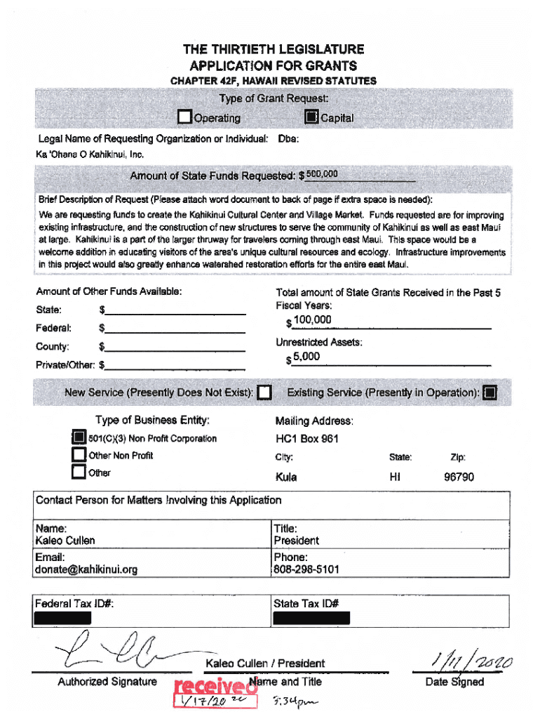 CHAPTER 42F, HAWAII REVISED STATUTESLegal Name of Requesting Organization or Individual:DBA:Key \'Ghana O Kahikinui, Inc. Brief Description of Request