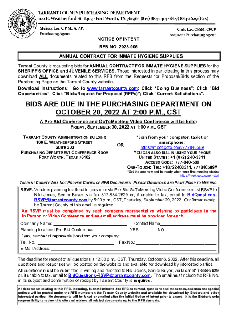 TARRANT COUNTY PURCHASING DEPARTMENT 100 E. Weatherford St. #303 Fort Worth, TX 76196 (817) 8841414 (817) 8842629 (Fax) Melissa Lee, C.P.M., A.P.P. Purchasing AgentNOTICE OF INTENT Chris Lax, CPM,