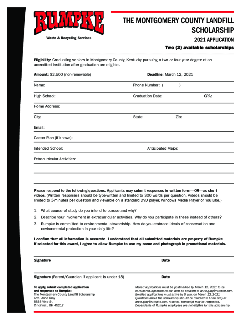 THE MONTGOMERY COUNTY LANDFILL SCHOLARSHIP Waste & Recycling Services2021 APPLICATION Two (2) available scholarshipsEligibility: Graduating seniors in Montgomery County, Kentucky pursuing a two or