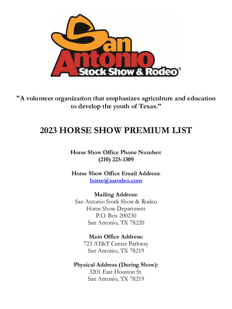 \” A volunteer organization that emphasizes agriculture and education to develop the youth of Texas.2023 HORSE SHOW PREMIUM LIST Horse Show Office Phone Number: (210) 2251309 Horse Show Office Email
