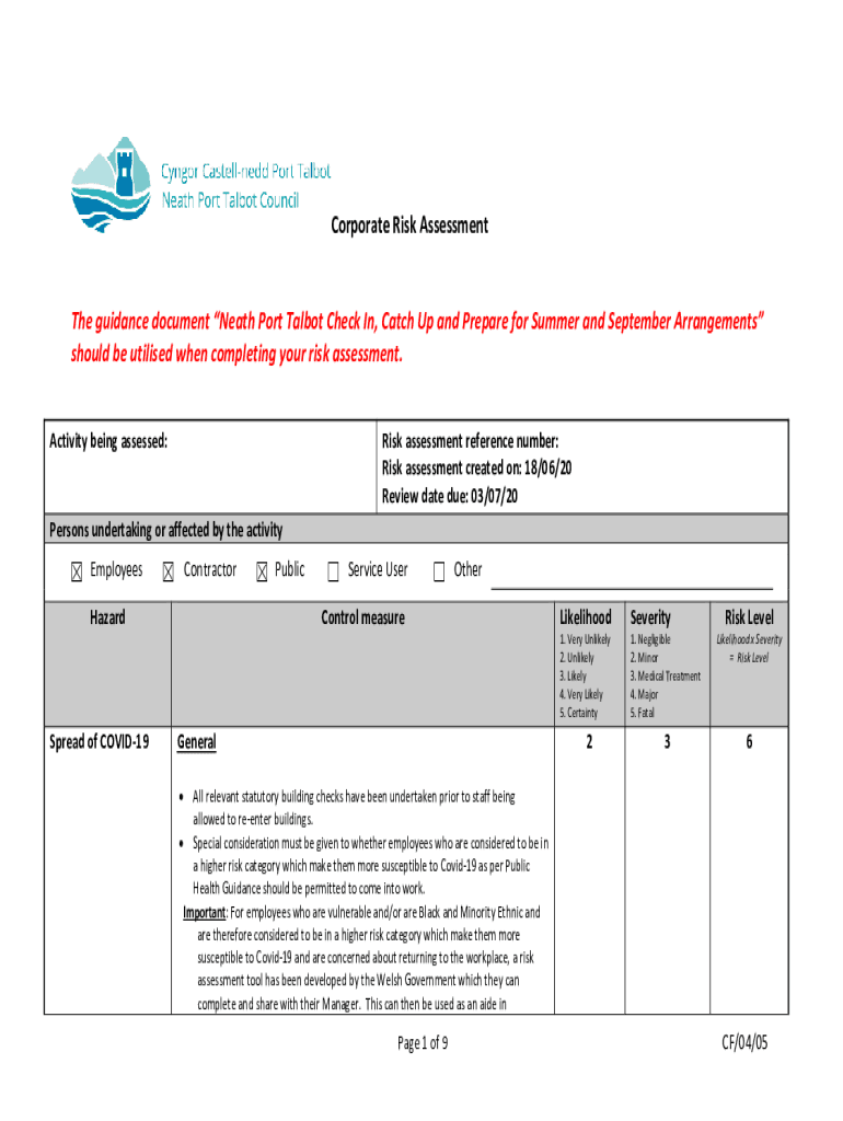 Corporate Risk Assessment guidance document Neath Port Talbot Check In, Catch Up and Prepare for Summer and September Arrangements should be utilized when completing your risk assessment. Activity