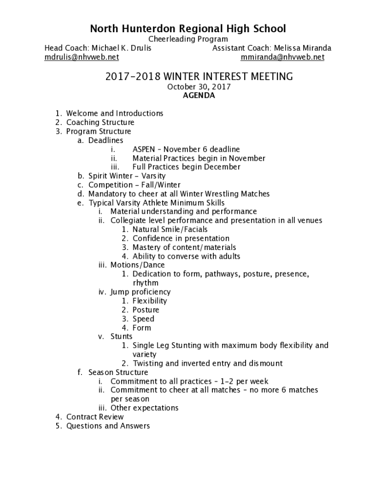 North Hunter don Regional High SchoolCheerleading Program Head Coach: Michael K. Rules Assistant Coach: Melissa Miranda mdrulis@nhvweb.net mmiranda@nhvweb.net20172018 WINTER INTEREST MEETING October