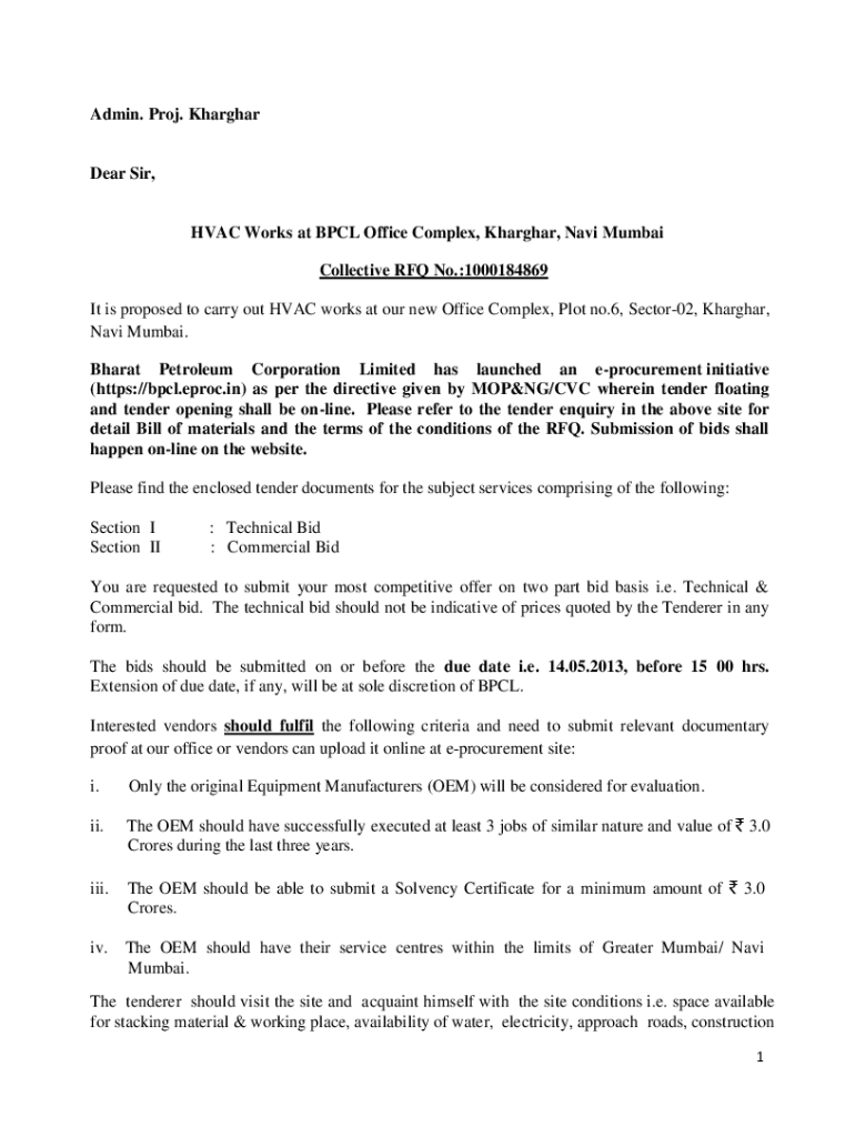Admin. Pro. KhargharDear Sir, HVAC Works at BCL Office Complex, Shanghai, Navi Mumbai