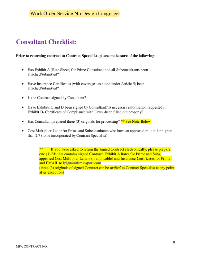 Work OrderServiceNo Design LanguageConsultant Checklist: Prior to returning contract to Contract Specialist, please make sure of the following: Has Exhibit A (Rate Sheet) for Prime Consultant and