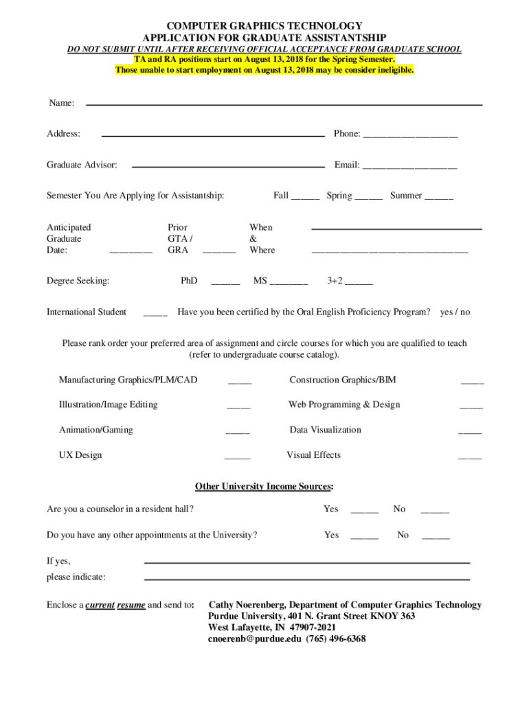 COMPUTER GRAPHICS TECHNOLOGY APPLICATION FOR GRADUATE ASSISTANTS HIP DO NOT SUBMIT UNTIL AFTER RECEIVING OFFICIAL ACCEPTANCE FROM GRADUATE SCHOOL TA and RA positions start on August 13, 2018, for