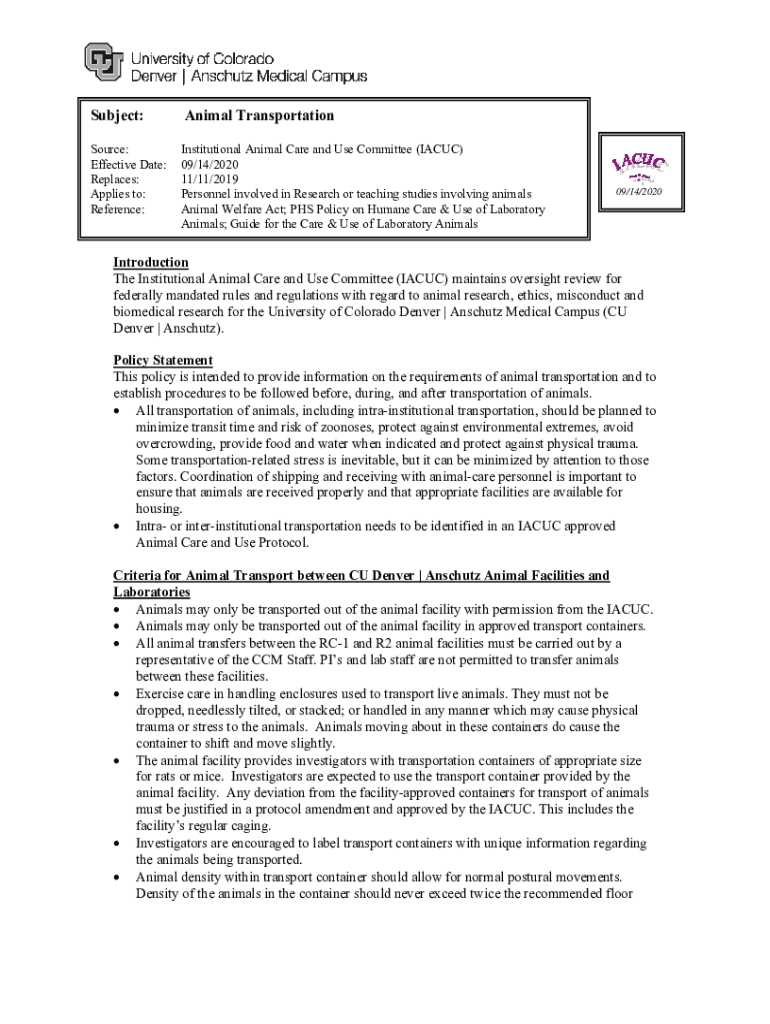 Subject: Source: Effective Date: Replaces: Applies to: Reference:Animal Transportation Institutional Animal Care and Use Committee (IACUC) 09/14/2020 11/11/2019 Personnel involved in Research or teaching