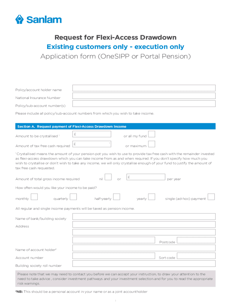 Request for FlexiAccess Drawdown Existing customers only execution only Application form (One SIPP or Portal Pension)Policy/account holder navigational Insurance NumberPolicy/subaccount number(s)Please
