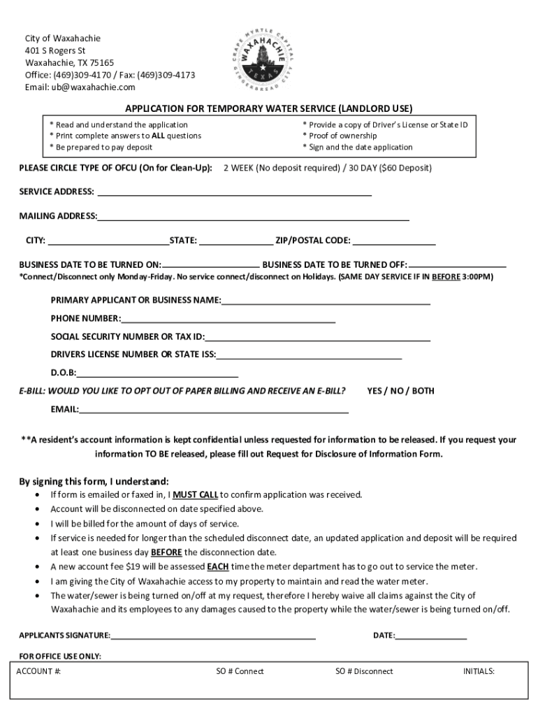 City of Waxahachie 401 S Rogers St Waxahachie, TX 75165 Office: (469)3094170 / Fax: (469)3094173 Email: ub@waxahachie.comAPPLICATION FOR TEMPORARY WATER SERVICE (LANDLORD USE) * Read and understand