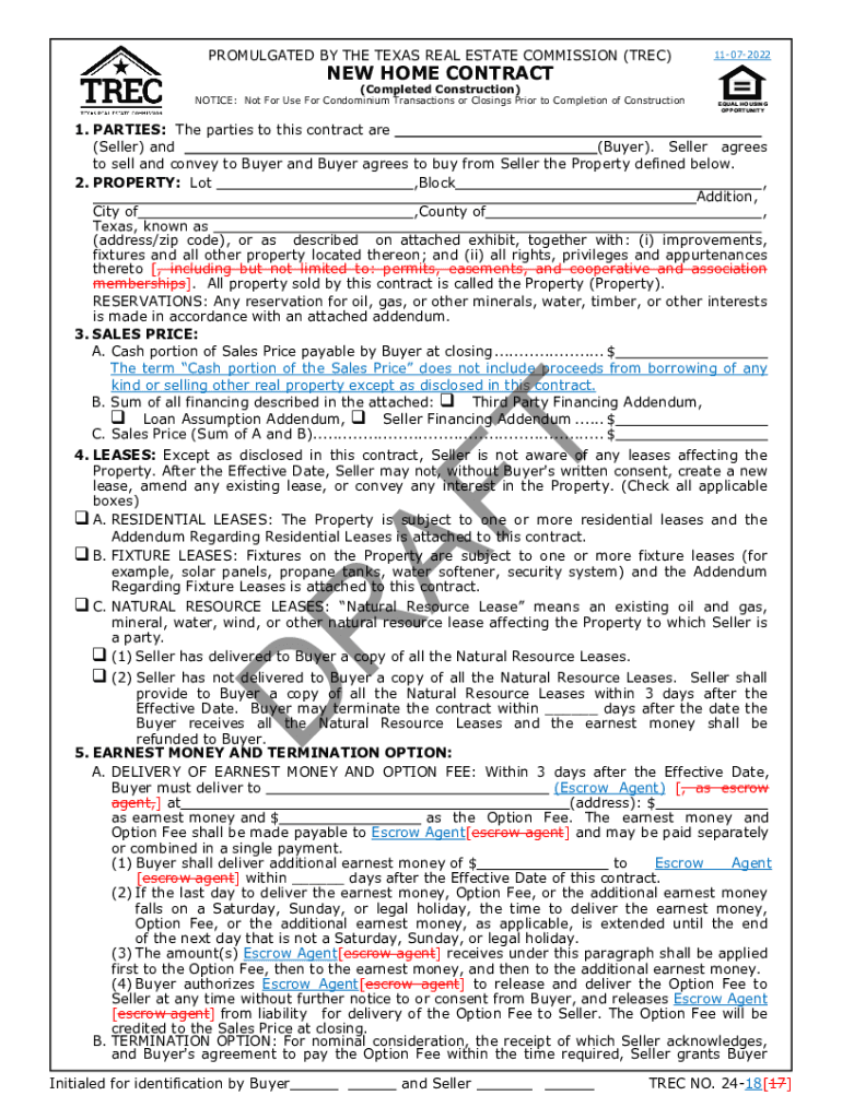 Contract Concerning [11082021]of 11 PROMULGATED BY THE TEXAS REAL ESTATE COMMISSION Page (TREE) (Address of Property)11072022NEW HOME CONTRACT (Completed Construction)NOTICE: Not For Use For Condominium
