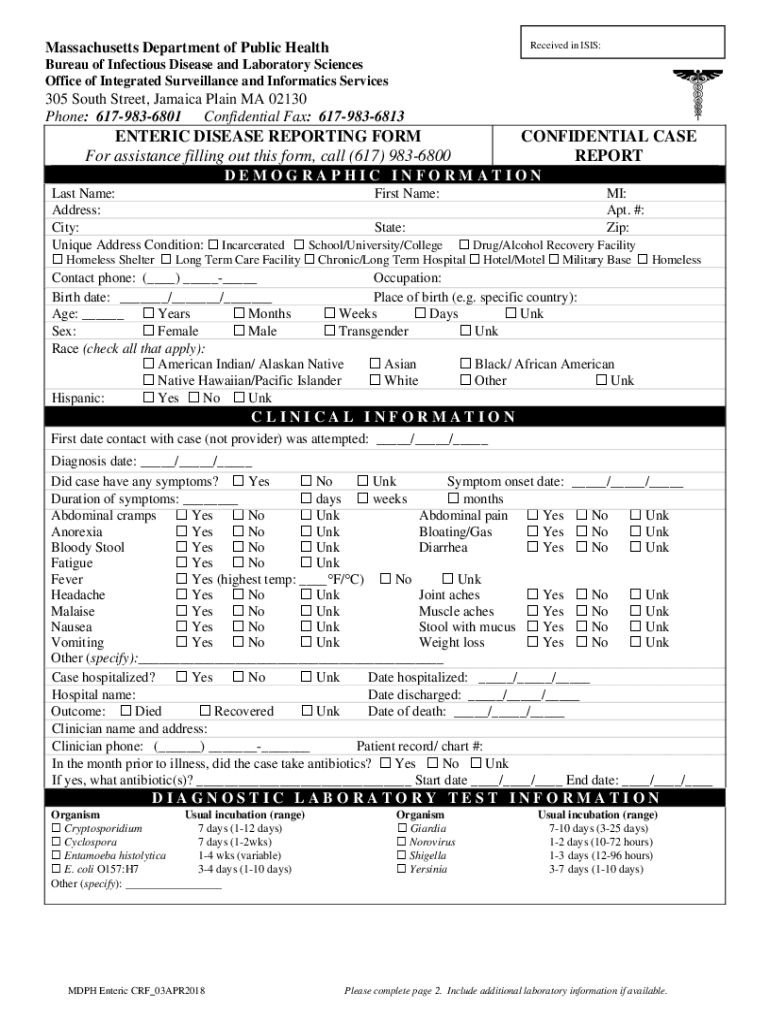 Received in ISIS:Massachusetts Department of Public Health Bureau of Infectious Disease and Laboratory Sciences Office of Integrated Surveillance and Informatics Services305 South Street, Jamaica