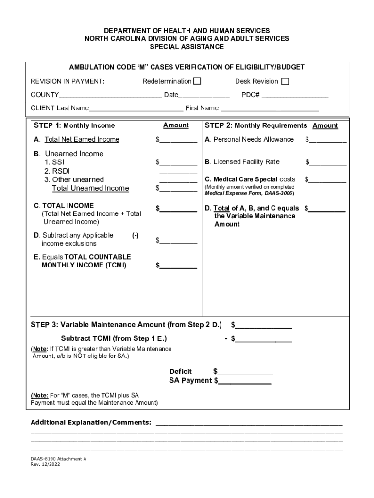 DEPARTMENT OF HEALTH AND HUMAN SERVICES NORTH CAROLINA DIVISION OF AGING AND ADULT SERVICES SPECIAL ASSISTANCE AMBULATION CODE M CASES VERIFICATION OF ELIGIBILITY/BUDGET Redetermination REVISION IN