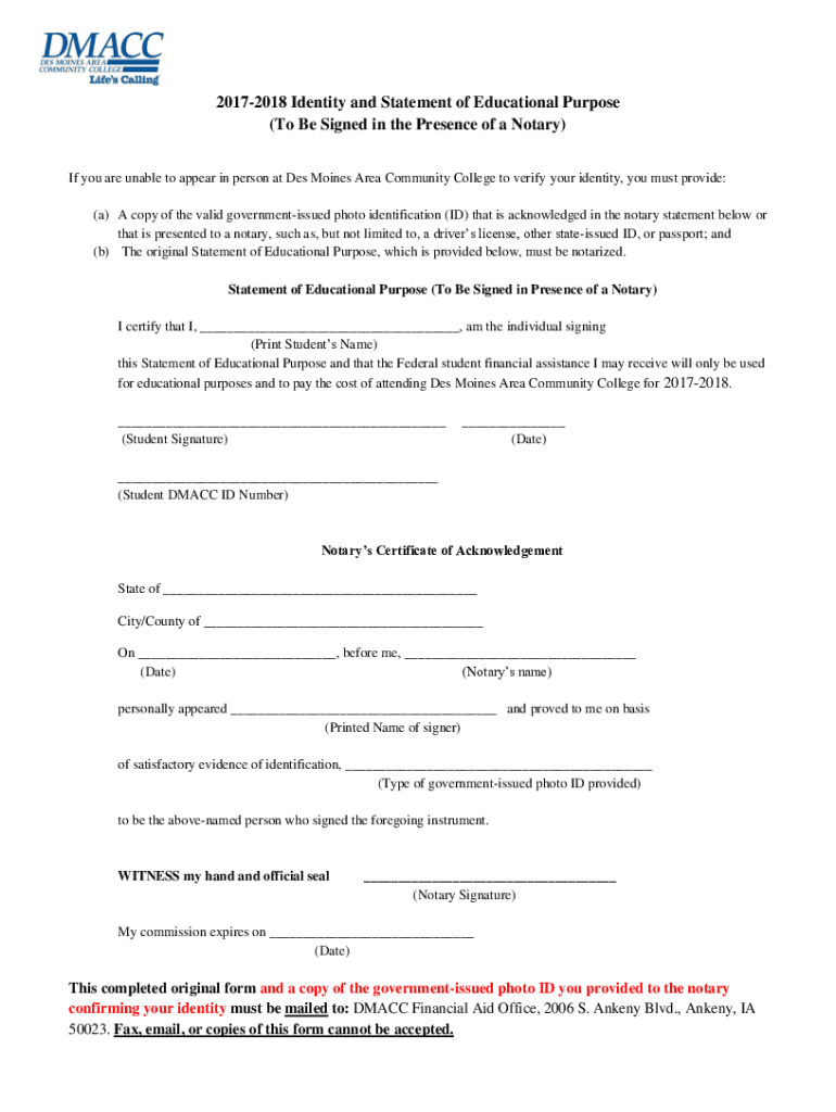 20172018 Identity and Statement of Educational Purpose (To Be Signed in the Presence of a Notary) If you are unable to appear in person at Des Moines Area Community College to verify your identity,