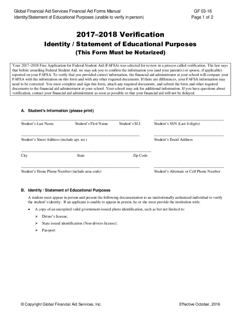 Global Financial Aid Services Financial Aid Forms Manual Identity/Statement of Educational Purposes (unable to verify in person)GF 0316-Page 1 of 220172018 Verification Identity / Statement of Educational