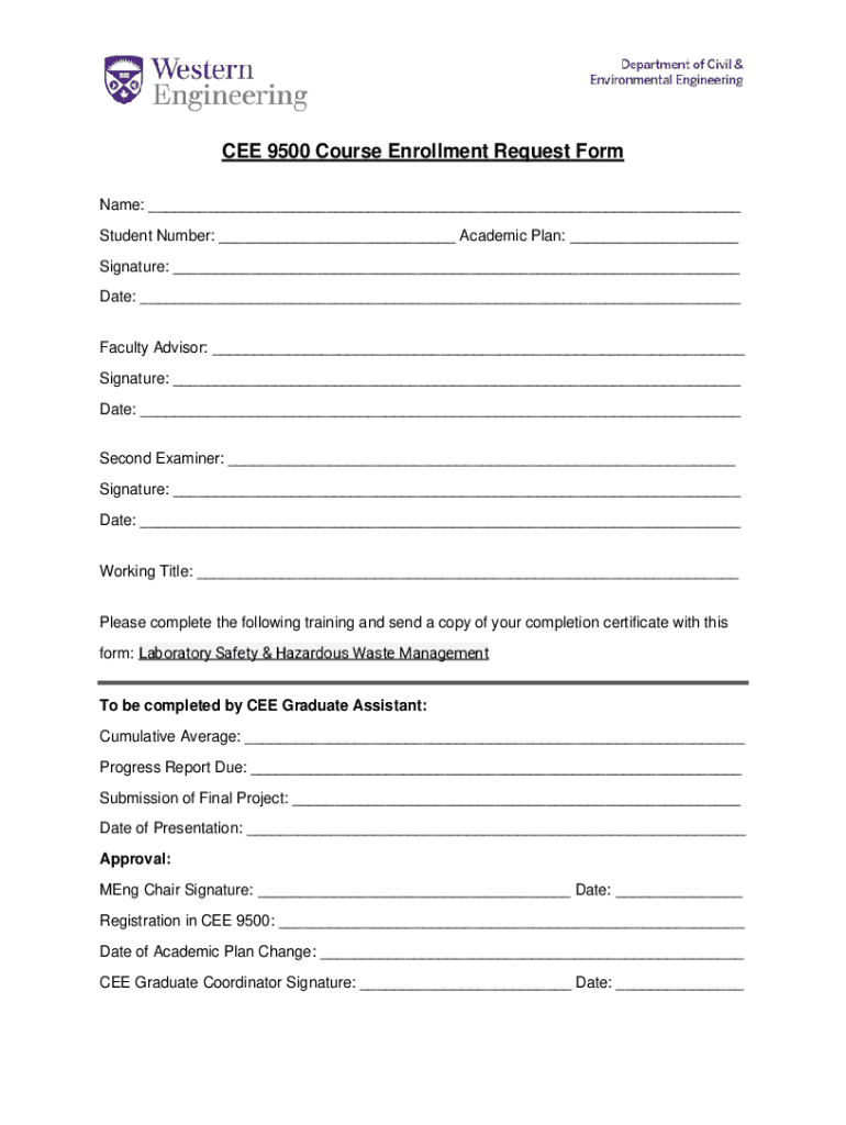 CEE 9500 Course Enrollment Request Form Name: ___ Student Number: ___ Academic Plan: ___ Signature: ___ Date: ___ Faculty Advisor: ___ Signature: ___ Date: ___ Second Examiner: ___ Signature: ___