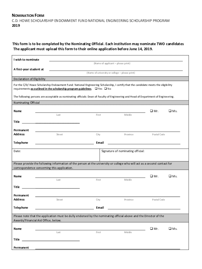 NOMINATION FORM C.D. HOWE SCHOLARSHIP ENDOWMENT FUND NATIONAL ENGINEERING SCHOLARSHIP PROGRAM 2019This form is to be completed by the Nominating Official. Each institution may nominate TWO candidates