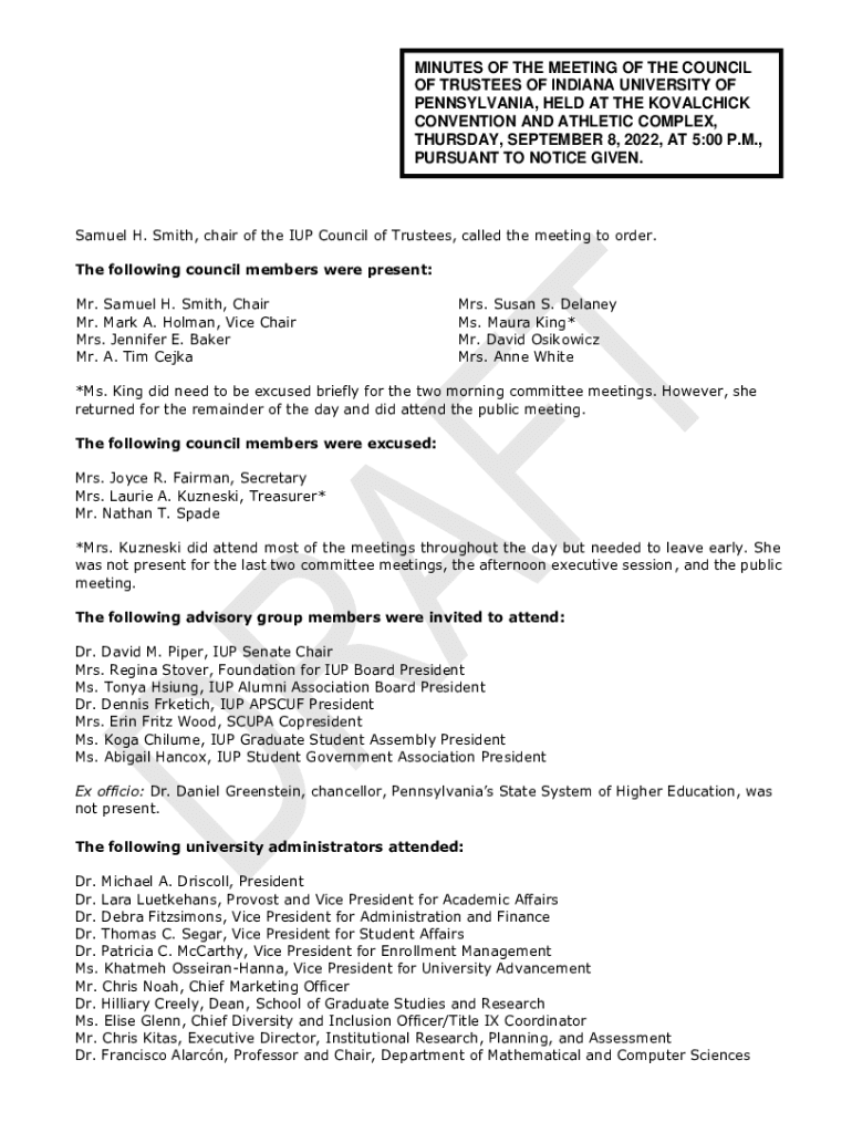 MINUTES OF THE MEETING OF THE COUNCIL OF TRUSTEES OF INDIANA UNIVERSITY OF PENNSYLVANIA, HELD AT THE KOVALCHICK CONVENTION AND ATHLETIC COMPLEX, THURSDAY, SEPTEMBER 8, 2022, AT 5:00 P.M., PURSUANT