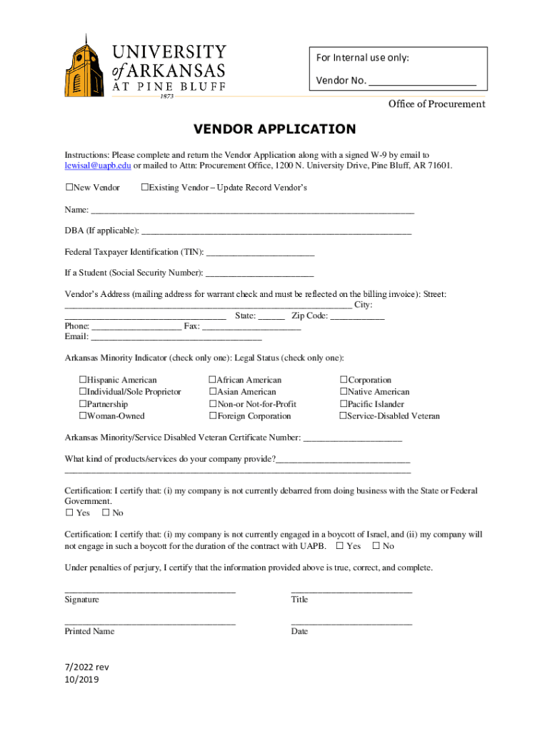 For Internal use only: Vendor No. ___ Office of ProcurementVENDOR APPLICATION Instructions: Please complete and return the Vendor Application along with a signed W9 by email to lewisal@uapb.edu or