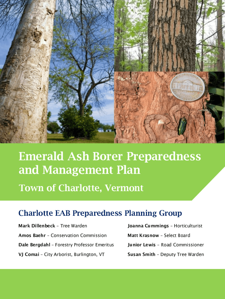 Emerald Ash Borer Preparedness and Management Plan Town of Charlotte, Vermont Charlotte EAT Preparedness Planning Group Mark Dillenbeck Tree Warden Joanna Cummings Horticulturist Amos Beyer Conservation