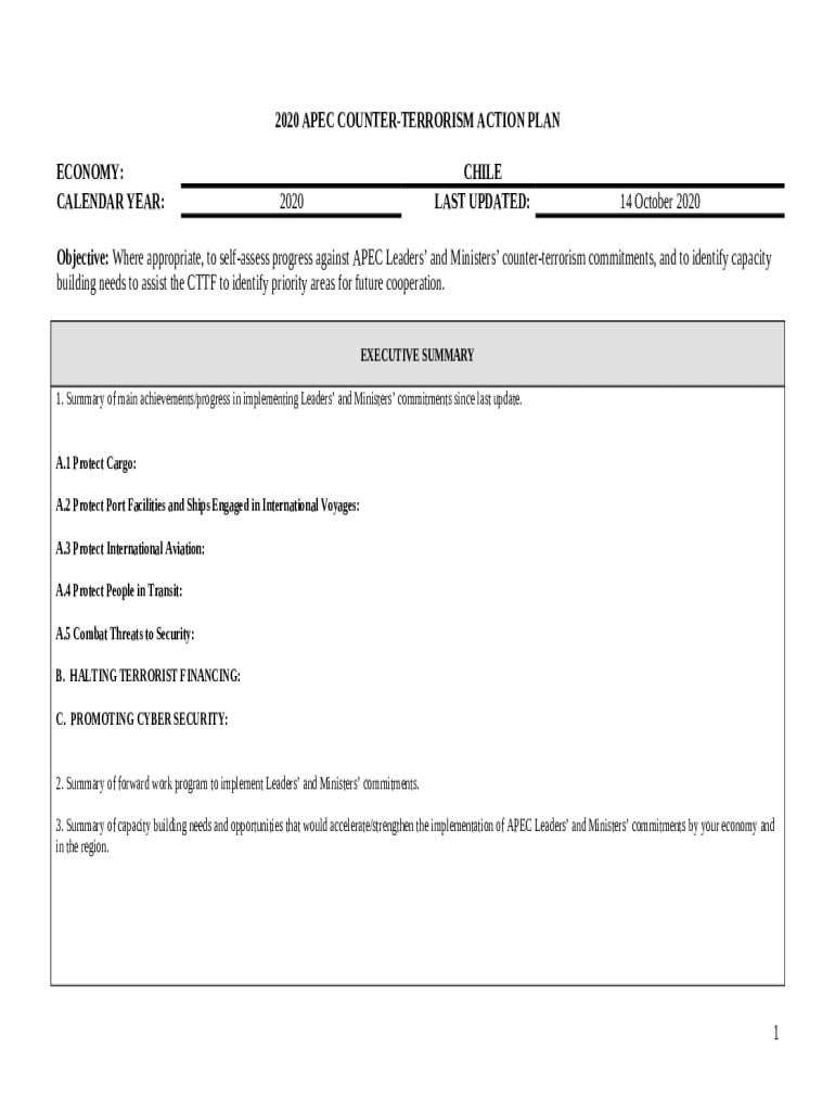 The Objective: Where appropriate, to self-assess progress against APEC Leaders' and Ministers' counter-terrorism commitments, and to identify capacity building needs to assist the CTTF to identify priority areas for future cooperation is a document required to be submitted to the required address to provide certain information. It has to be filled-out and signed, which is possible manually, or using a certain solution e. g. PDFfiller. This tool allows to fill out any PDF or Word document directly from your browser (no software requred), customize it depending on your requirements and put a legally-binding e-signature. Right after completion, the user can send the Objective: Where appropriate, to self-assess progress against APEC Leaders' and Ministers' counter-terrorism commitments, and to identify capacity building needs to assist the CTTF to identify priority areas for future cooperation to the relevant receiver, or multiple recipients via email or fax. The blank is printable as well because of PDFfiller feature and options presented for printing out adjustment. In both digital and physical appearance, your form will have got organized and professional look. It's also possible to save it as the template to use it later, without creating a new document from the beginning. You need just to edit the ready form.