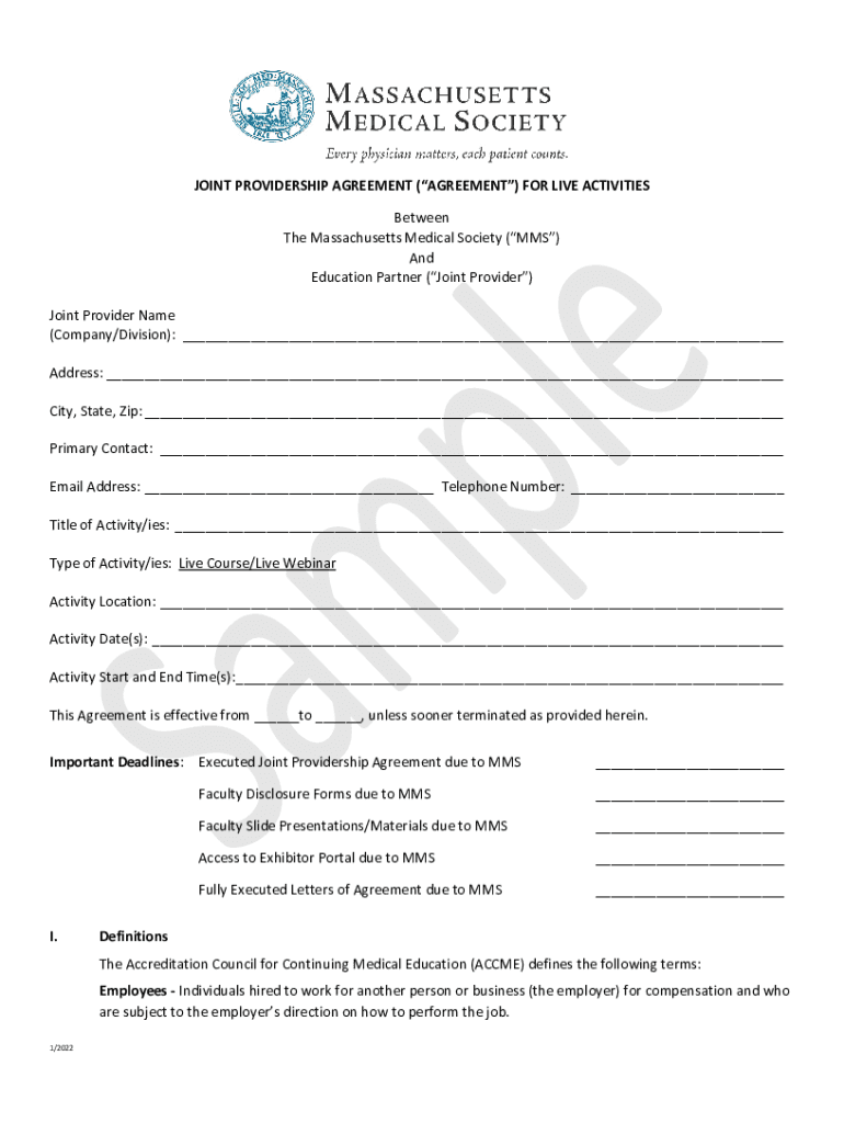 JOINT PROVIDERS HIP AGREEMENT (AGREEMENT) FOR LIVE ACTIVITIES Between The Massachusetts Medical Society (MMS) And Education Partner (Joint Provider) Joint Provider Name (Company/Division): ___ Address:
