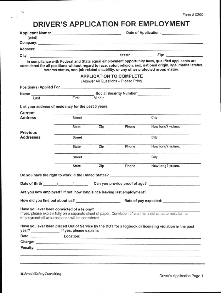 Form # 0200DRIVER\'S APPLICATION FOR EMPLOYMENT Date of Application:Applicant Name: (print) Company: Address:Zip:State:City:In compliance with Federal and State equal employment opportunity laws,