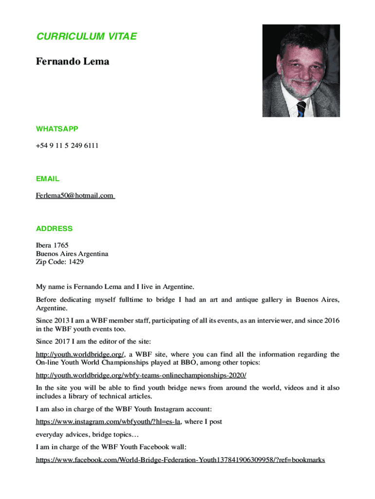 CURRICULUM VITAE Fernando LemaWHATSAPP +54 9 11 5 249 6111EMAIL Ferlema50@hotmail.comADDRESS Iberia 1765 Buenos Aires Argentina Zip Code: 1429My name is Fernando Lima and I live in Argentine. Before
