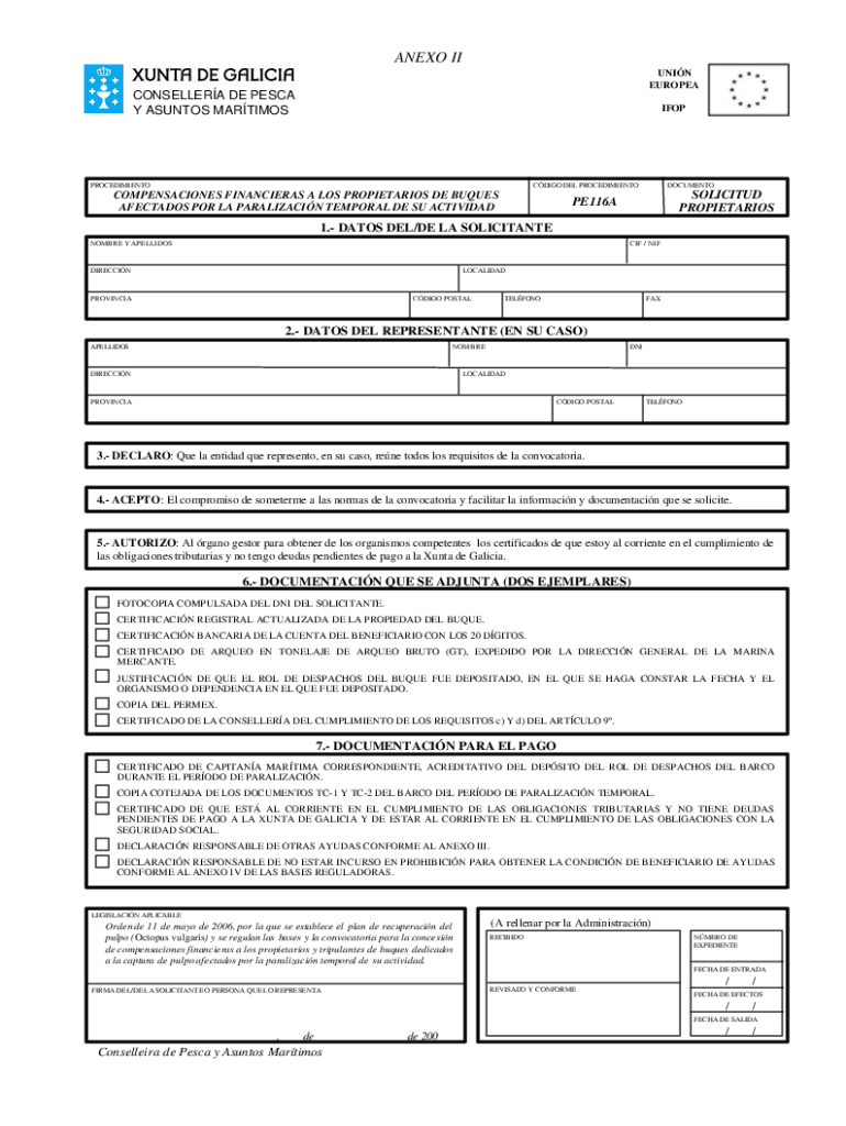 NEXT II UNIT EUROPEACONSELLERA DE PESC Y SANTOS MARTIMOSIFOPPROCEDIMIENTOCDIGO DEL PROCEDIMIENTOCOMPENSACIONES FINANCIERS A LOS PROPRIETARIES DE TUQUES AVOCADOS POR LA PARALIZACIN TEMPORAL DE SU ACTIVIDADDOCUMENTOSOLICITUD