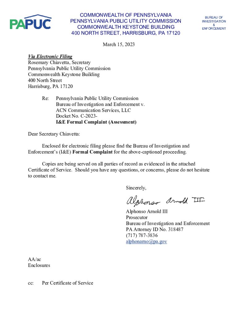 COMMONWEALTH OF PENNSYLVANIA PUBLIC UTILITY COMMISSION COMMONWEALTH KEYSTONE BUILDING 400 NORTH STREET, HARRISBURG, PA 17120BUREAU OF INVESTIGATION & ENFORCEMENT March 15, 2023, Via Electronic Filing