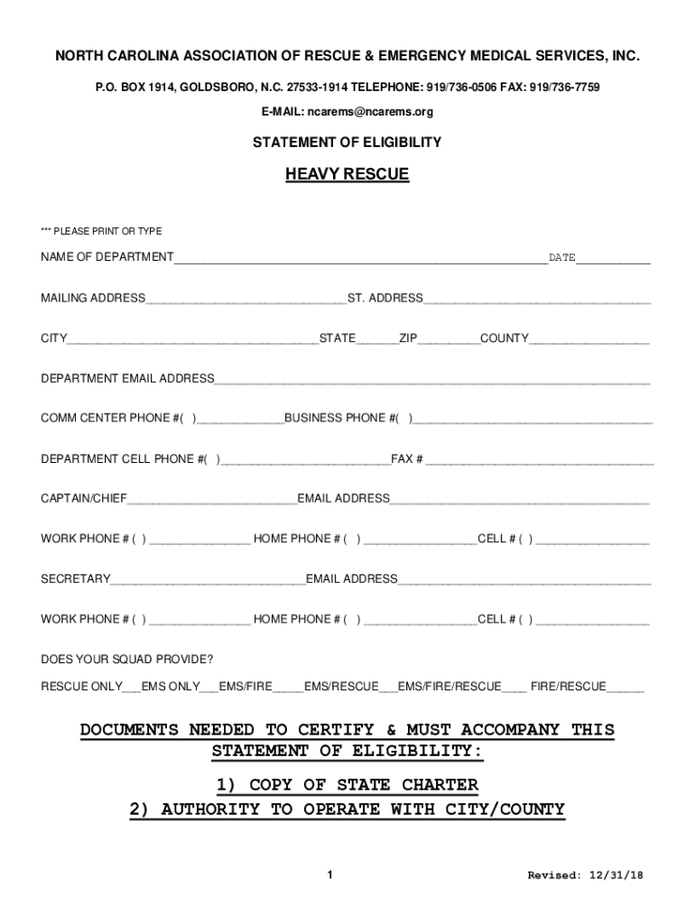NORTH CAROLINA ASSOCIATION OF RESCUE & EMERGENCY MEDICAL SERVICES, INC. P.O. BOX 1914, GOLDSBORO, N.C. 275331914 TELEPHONE: 919/7360506 FAX: 919/7367759 EMAIL: ncarems@ncarems.orgSTATEMENT OF ELIGIBILITYHEAVY