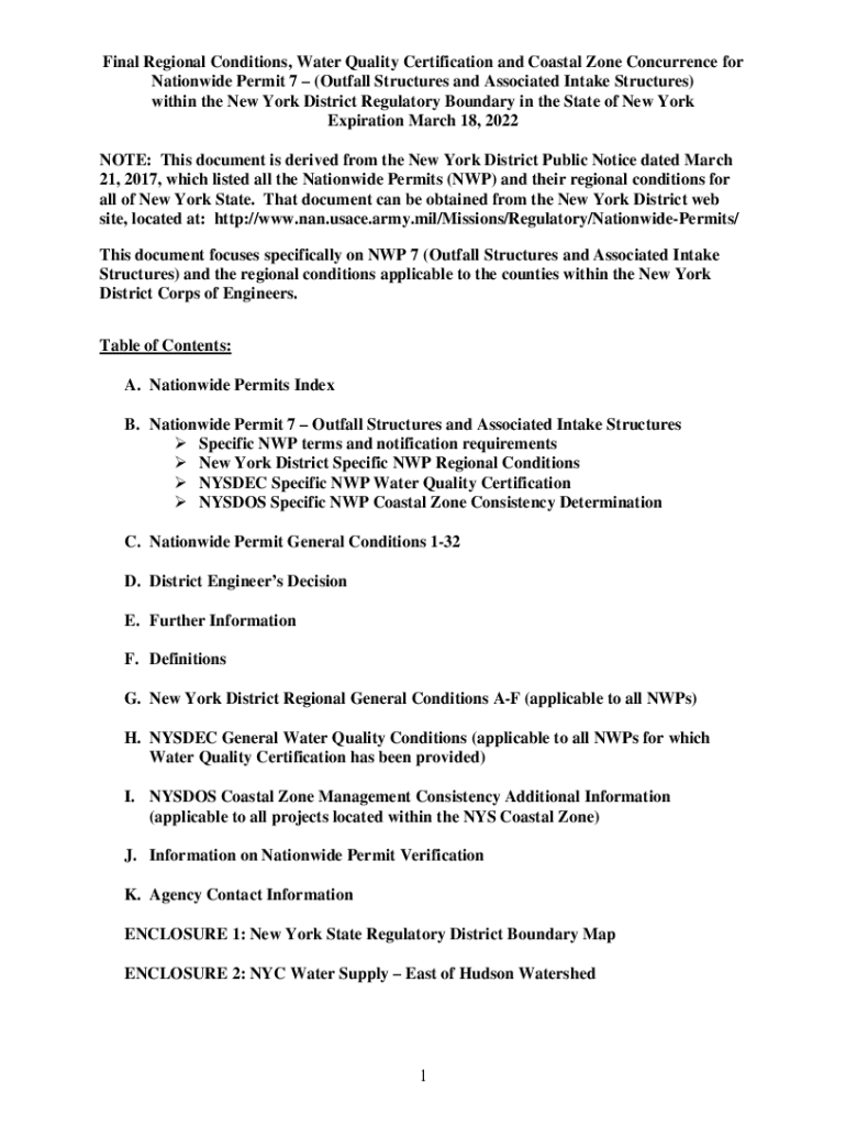 Final Regional Conditions, Water Quality Certification and Coastal Zone Concurrence for Nationwide Permit 7 (Outfall Structures and Associated Intake Structures) within the New York District Regulatory