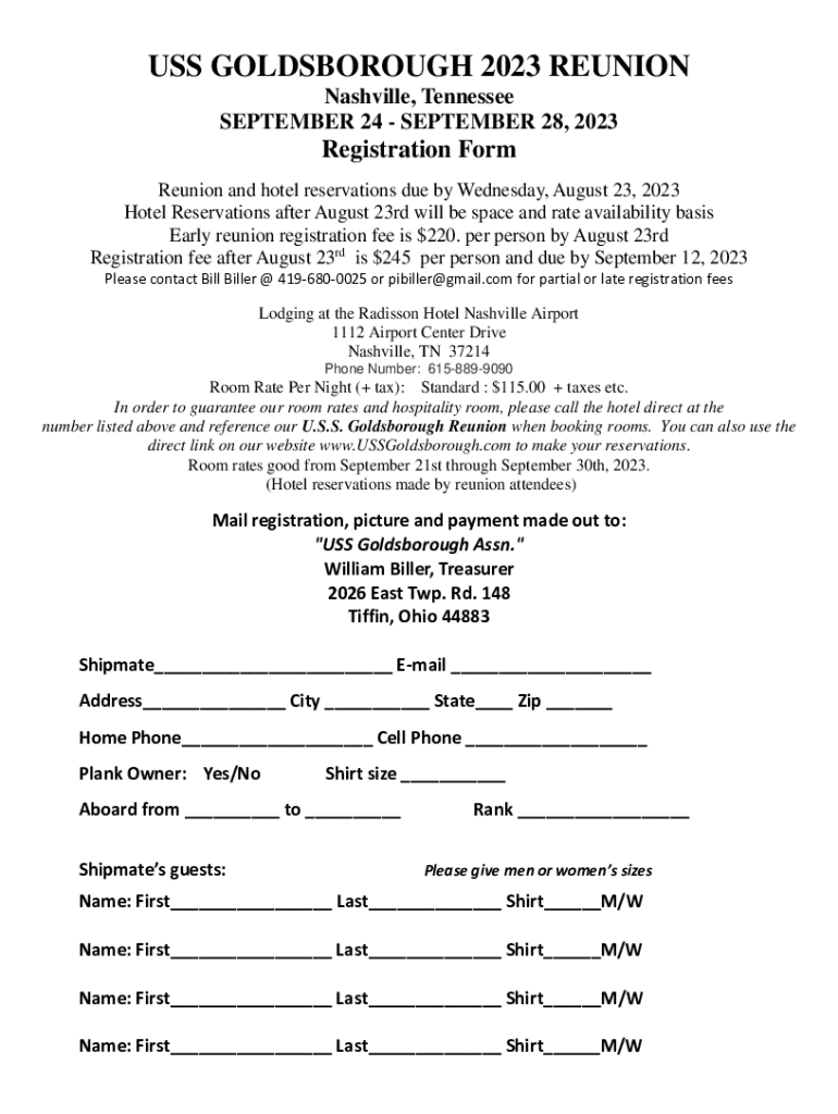 USS GAINSBOROUGH 2023 REUNION Nashville, Tennessee SEPTEMBER 24 SEPTEMBER 28, 2023Registration Form Reunion and hotel reservations due by Wednesday, August 23, 2023, Hotel Reservations after August