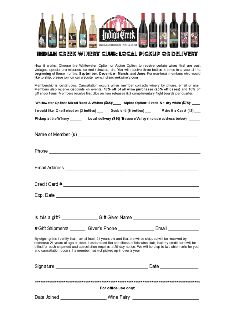 INDIAN CREEK WINERY CLUB: LOCAL PICKUP OR DELIVERY How it works: Choose the Whitewater Option or Alpine Option to receive certain wines that are past vintages, special prerelease, current releases,