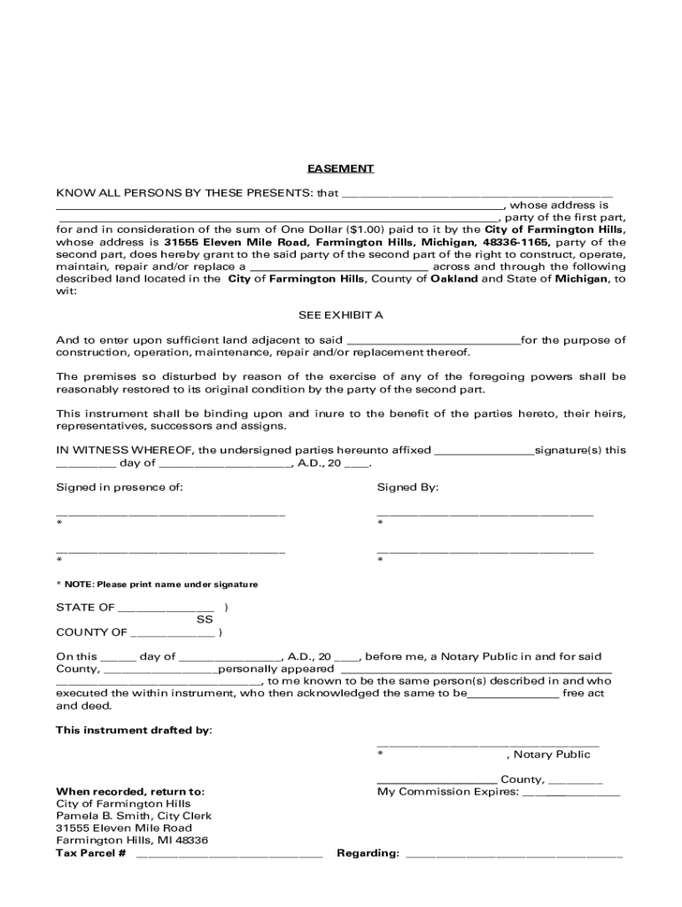 EASEMENT KNOW ALL PERSONS BY THESE PRESENTS: that ___ ___, whose address is, party of the first part, for and in consideration of the sum of One Dollar ($1.00) paid to it by the City of Farmington