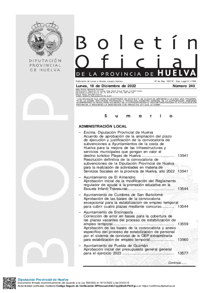 Publication DE Lines an Earned, except festivosLunes, 19 de December de 2022 N de Reg. 1567/76 DEP. Legal H11958Nmero 240Edita: Extra. Deputation Provincial Administration: Deputation de Huelva.