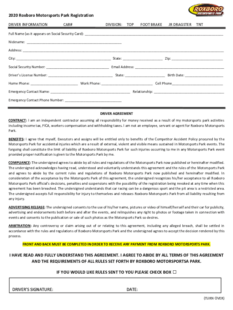 2020 Roxbury Motorsports Park Registration DRIVER INFORMATIONAL#DIVISION:TOPMOST BAKER DRAGSTERTNTFull Name (as it appears on Social Security Card): ___ Nickname: ___ Address: ___ City: ___ State: