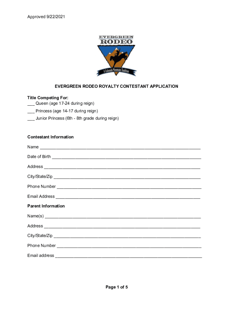 Approved 9/22/2021EVERGREEN RODEO ROYALTY CONTESTANT APPLICATION Title Competing For: ___ Queen (age 1724 during reign) ___ Princess (age 1417 during reign) ___ Junior Princess (6th 8th grade during