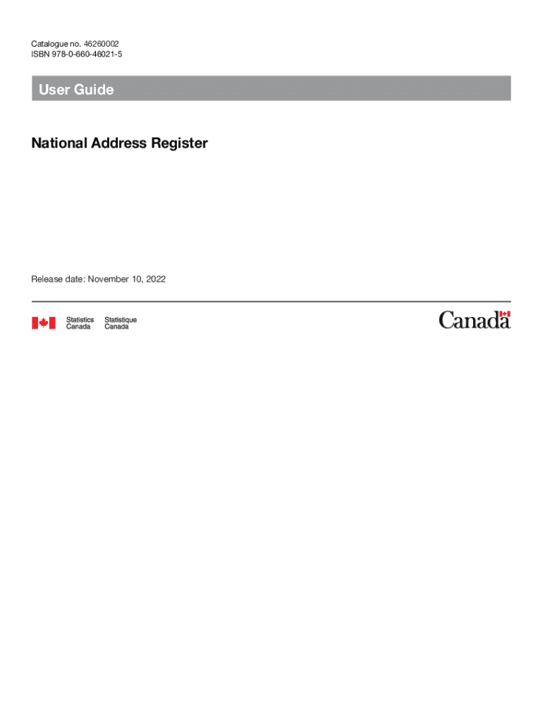 Catalog no. 46260002 ISBN 9780660460215User Guide National Address RegisterRelease date: November 10, 2022How to obtain more information For information about this product or the wide range of services