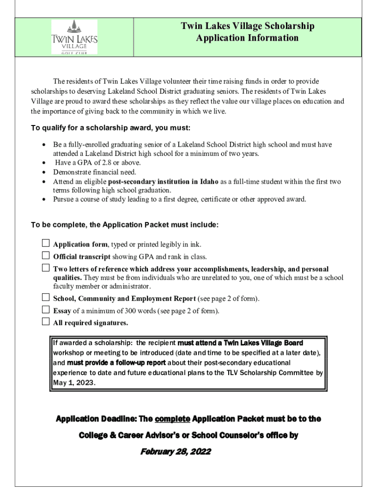 Twin Lakes Village Scholarship Application Information residents of Twin Lakes Village volunteer their time raising funds in order to provide scholarships to deserving Lakeland School District graduating