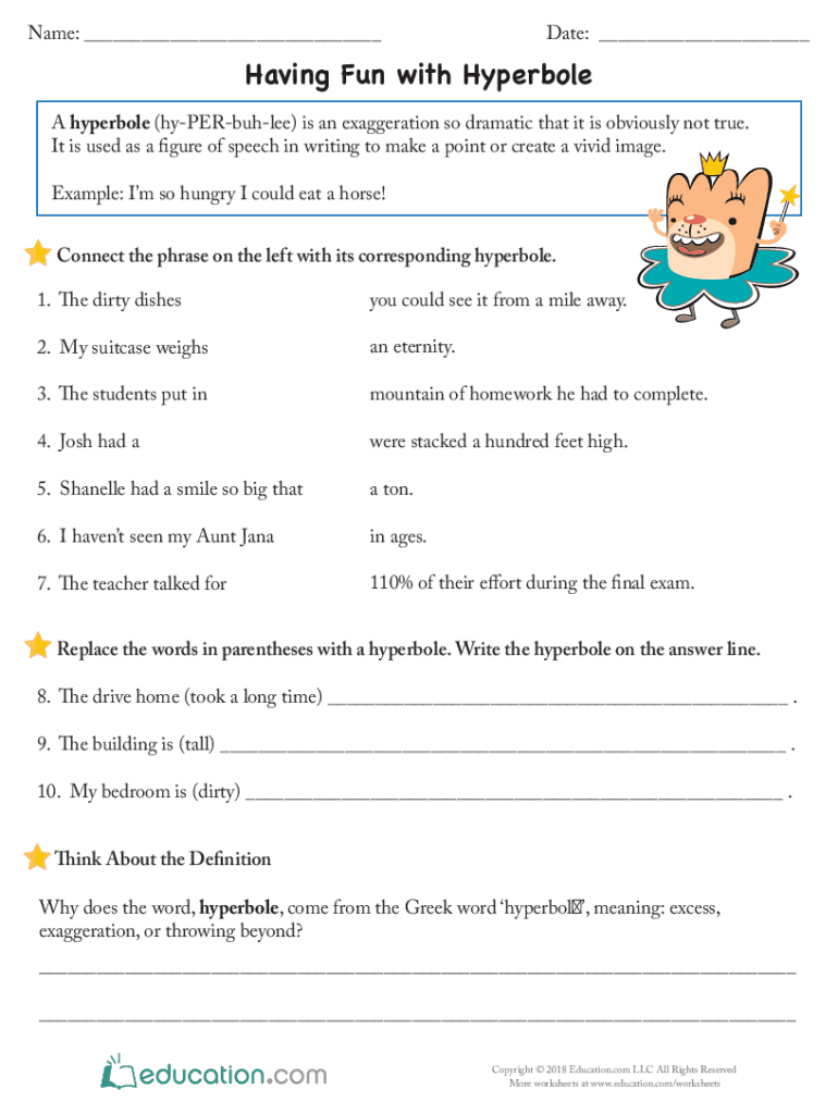 Anyone studying English language or literature may be required to fill out activity 6 hyperbole worksheet.